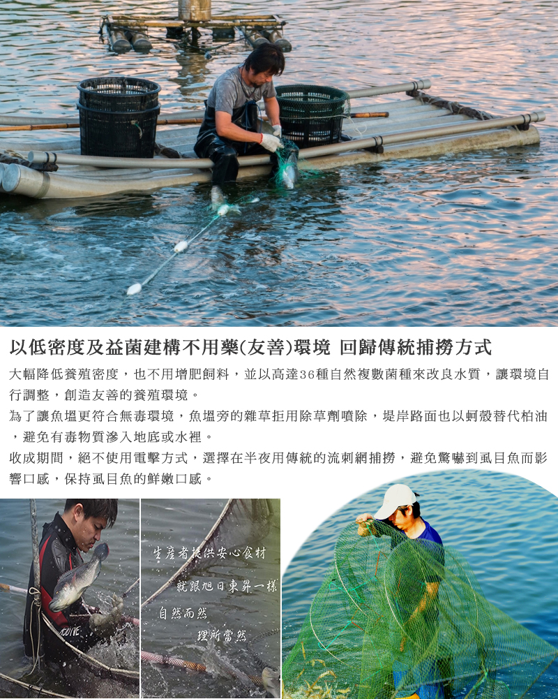 一般養殖戶一甲地放養3~5萬尾虱目魚,我們僅僅放養5千尾,這是不惜血本幾番測試後得出的最佳數量;讓虱目魚的生存空間變大後,活動力提高,虱目魚自然更健康,背肉也比較結實,不用增肥劑讓虱目魚有肥肚,回歸自然以海水養殖的長盈虱目魚擁有最佳模特兒身材!這樣的友善養殖工法,無需投藥就能有效降低魚隻生病的問題。