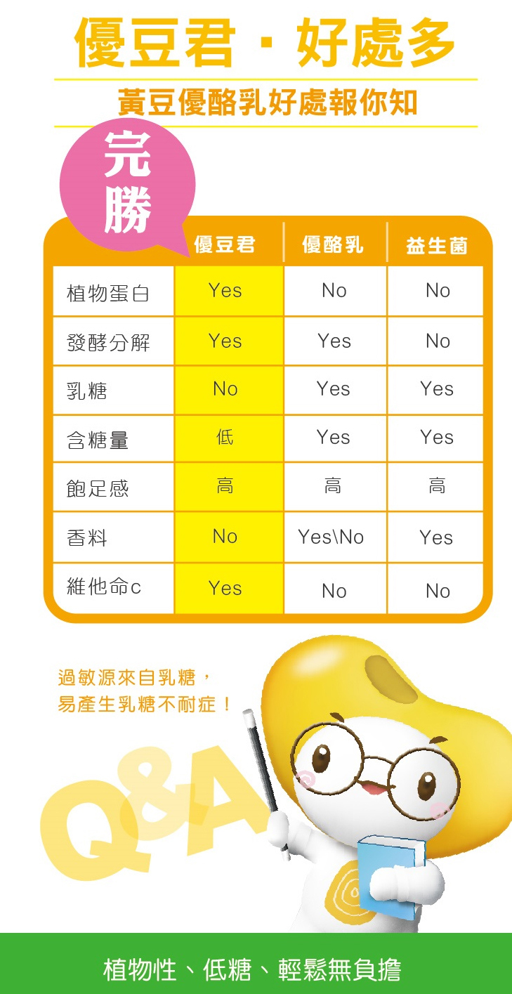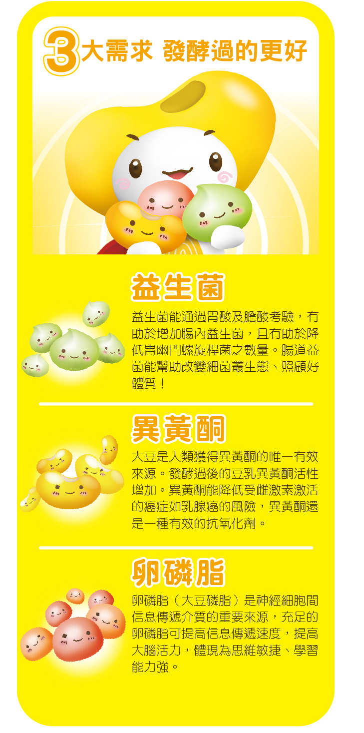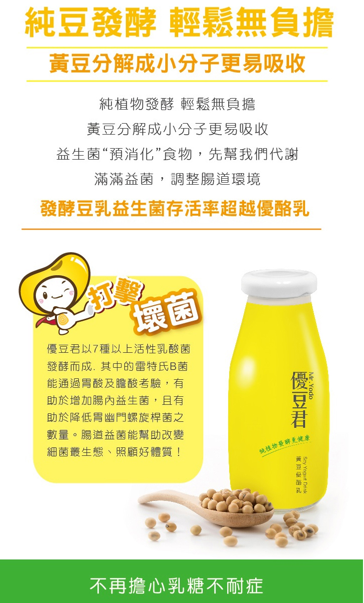 嚴選非基改黃豆,搭配多種植物性乳酸菌,純天然發酵,全程不添加香料與色素,每毫升含 1,000 萬活菌,同時享有豆漿的溫潤與優酪乳的清爽口感,特別適合蔬食者與乳糖不適族群;冷藏即飲,天天補充好菌,喝得安心、活力滿滿。