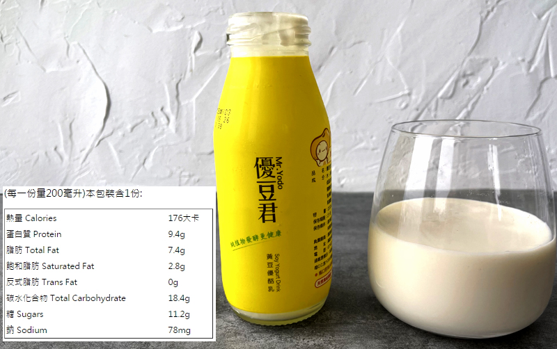 水、加拿大進口非基因改造黃豆、蔗糖、食鹽、檸檬、乳酸菌 (嗜熱鏈球菌、保加利亞乳桿菌、嗜酸乳桿菌、長雙歧乳桿菌、鼠李糖乳桿菌、植物乳桿菌、副乾酪乳桿菌、瑞士乳酸桿菌)