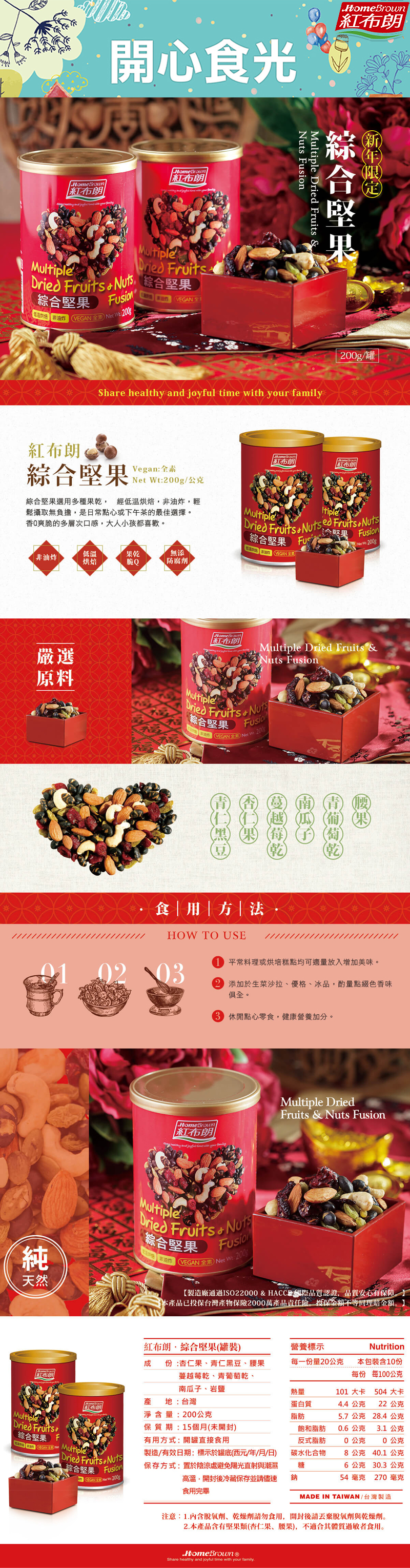 綜合堅果選用多種果乾,低烘焙、非油炸,輕鬆攝取無負擔,是日常點心或下午茶的最佳選擇;香Q爽脆的多層次口感,大人小孩都喜歡。