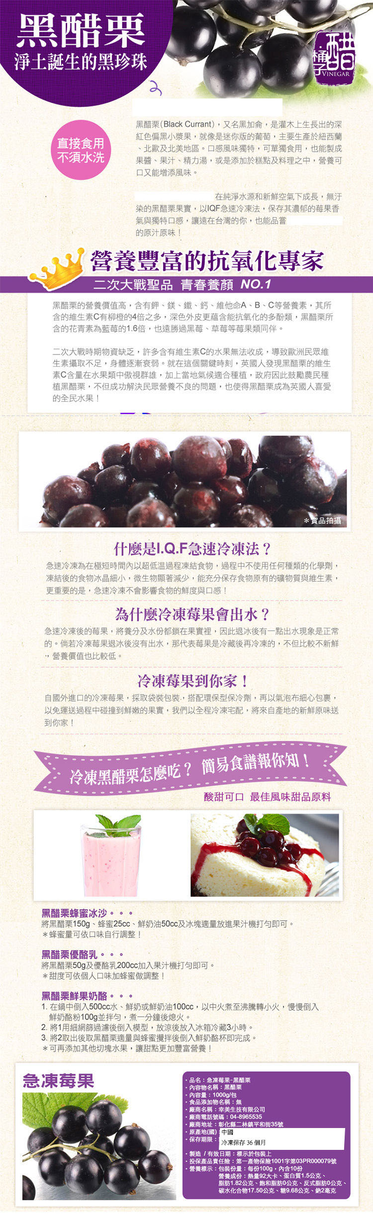 黑醋栗 (Black Currant),又名黑加侖,是灌木上生長出的深紅色偏黑小漿果,就像是迷你版的葡萄,主要生產於紐西蘭、北歐及北美地區。口感風味獨特,可單獨食用,也能製成果醬、果汁、精力湯,或是添加於糕點及料理之中,營養可口又能增添風味。