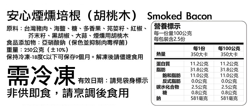 因為不想再吃市面上的商業培根了,所以「食貨集」開始自己製作培根。經過3年多的嘗試與調整,終於有自信推出傳統工序的煙燻培根了。使用來自台灣優質牧場出品的高級五花腩與天然香料、海鹽,經過8天傳統熟成製程,再使用進口胡桃木煙燻3小時後切片包裝;風味天然鮮美,煙燻味香氣逼人,這才是真正的歐美傳統培根滋味!