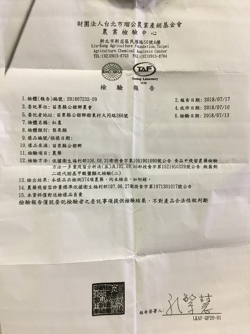 安全證明:農藥殘留374項檢驗未檢出