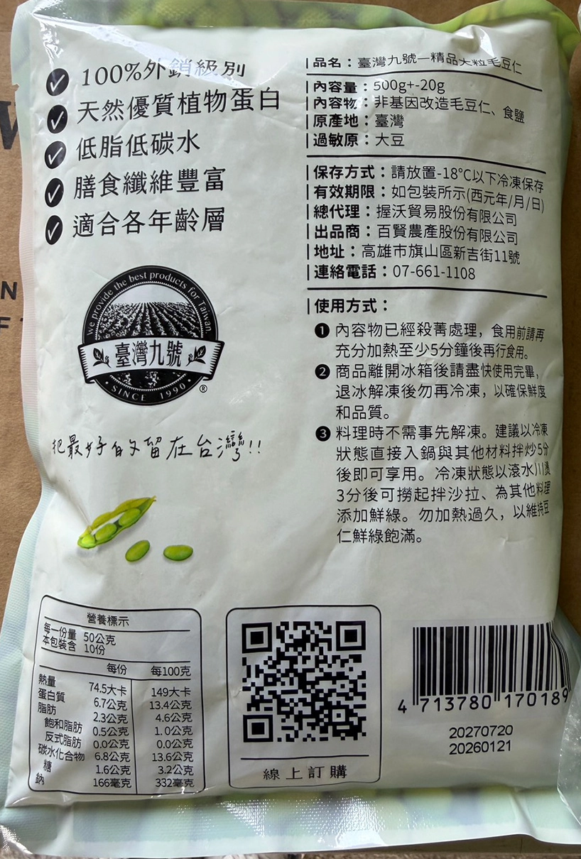 神農獎肯定的台灣九號非基改毛豆仁,由「毛豆先生」周國隆培育,產自高雄旗山,豆粒翠綠如玉、鮮甜無豆腥味。採收後 4 小時內加工,急速冷凍鎖住鮮度與營養,免剝殼、免解凍、免清洗,下鍋即用,健身族與素食者的綠色首選。