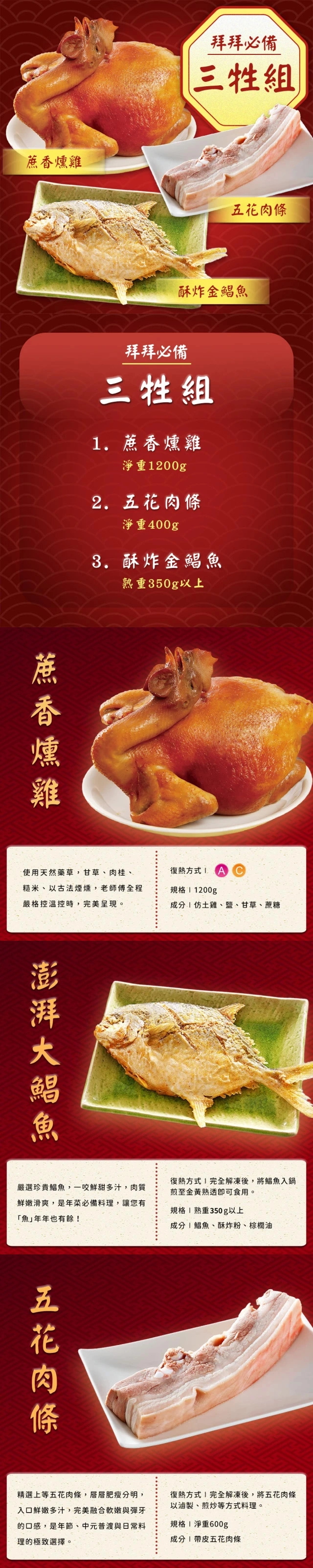 吉晟嚴選-祭拜必備三牲宅配組 (蔗香燻雞+酥炸鯧魚+帶皮豬五花)