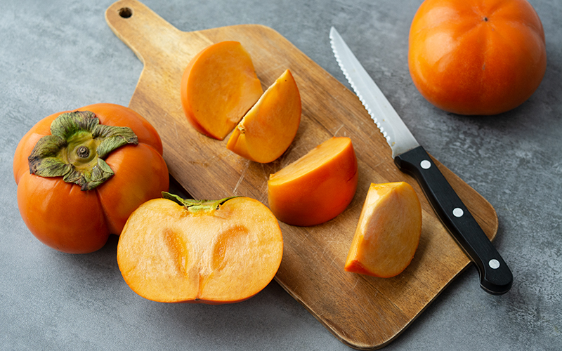 「富有甜柿」,果實碩大飽滿,頂部圓而紅潤,果肉細緻脆嫩,完熟時不會殘留澀味,採收後即可享用,果肉香甜脆口又多汁;「次郎甜柿」果實扁四方形,四周有凹痕明顯、外型像小南瓜,口感清甜。