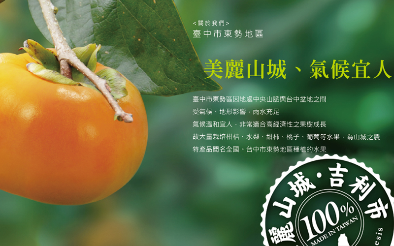 臺中市東勢區位在中央山脈與台中盆地之間,海拔最高為 1,200 公尺,氣候、地形影響下,雨水充足,非常適合高經濟價值的果樹成長,東勢區栽培柑桔、水梨、甜柿、桃子、葡萄等水果,近年更以山城農特產品為特色,聞名全國。