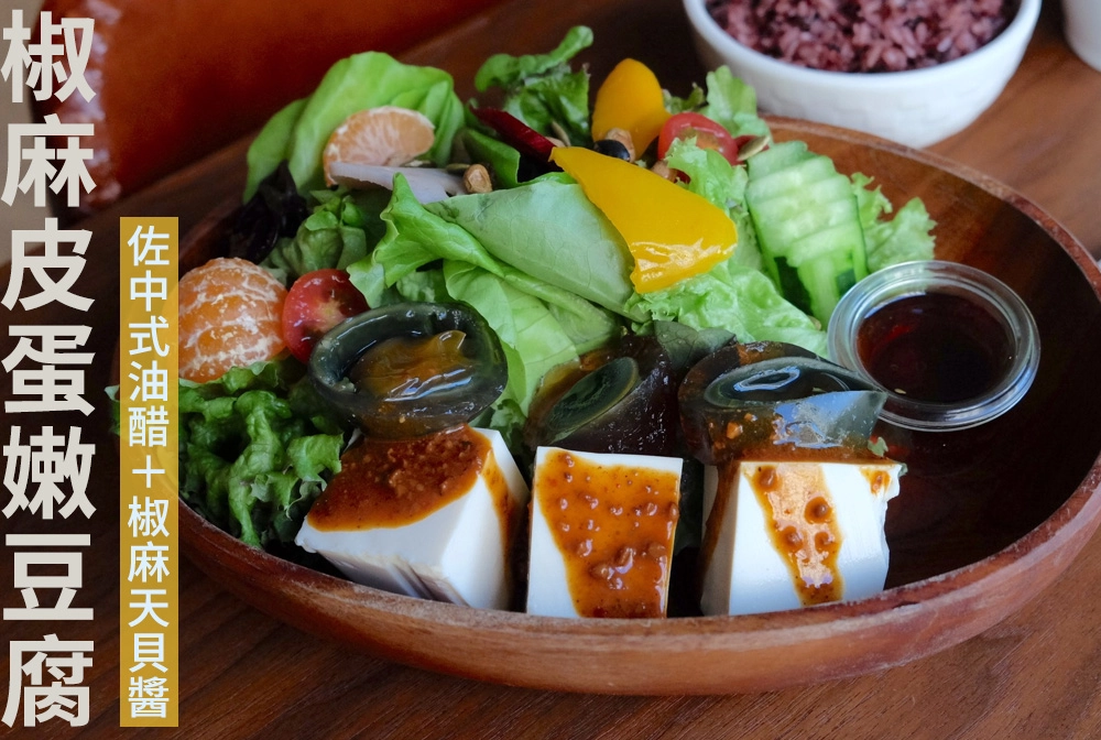 ▼ 椒麻皮蛋嫩豆腐 /佐中式油醋+椒麻天貝醬:大把脆甜的蔬食樂生菜,皮蛋淋上椒麻天貝醬,再來一口嫩豆腐,蛋白質滿滿,清爽飽足營養更到位。
