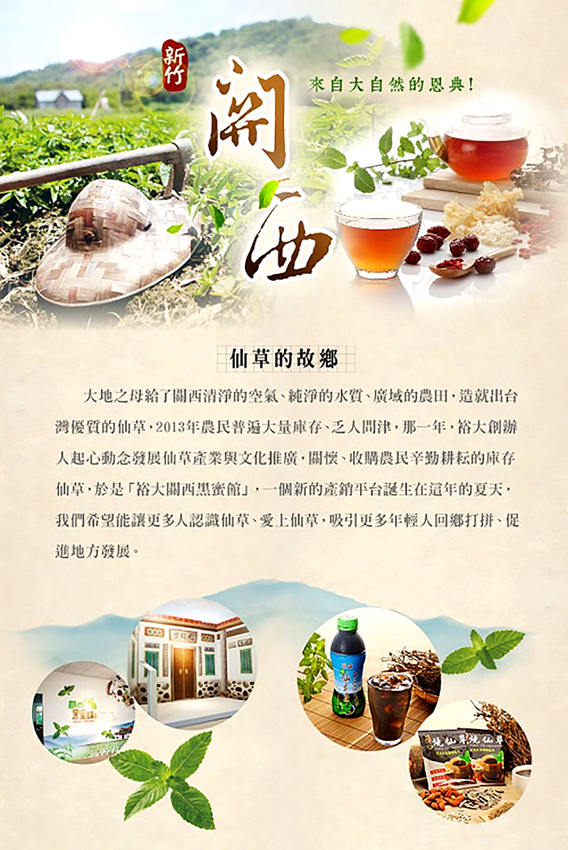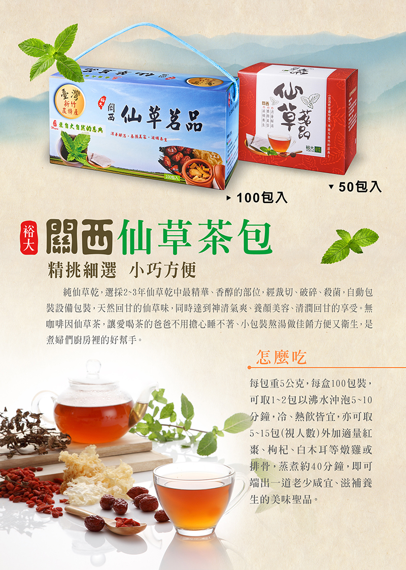 選採2~3年的純仙草乾,精挑細選最優質香純之部位,經裁切、破碎,高溫烘乾殺菌自動包裝設備包裝。