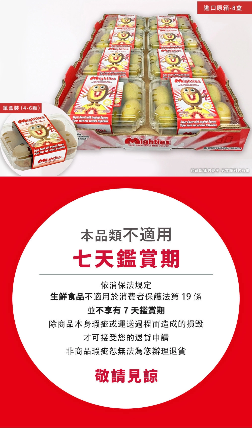 再次提醒您:水果類商品為有效期限短的生鮮蔬果類,依現行消保法規定「沒有」7天鑑賞期的服務,也無法因個人口感與喜好問題作為退貨標準,因此請確認商品規格與說明再訂購。