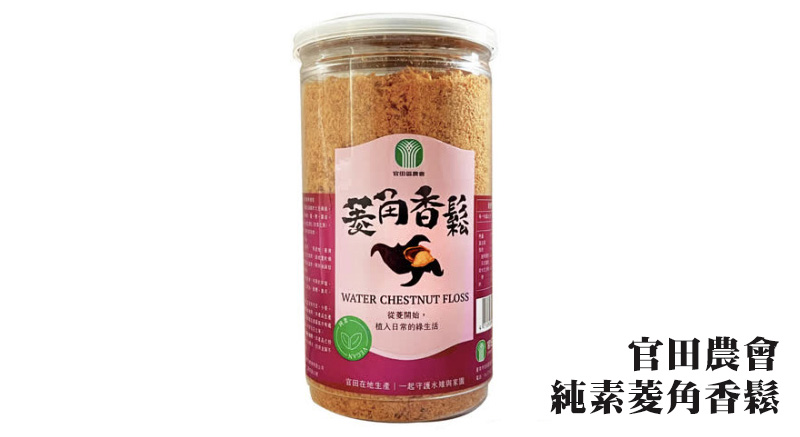 官田農會加工研發許多菱角食品,其中一項為全素食的菱角香鬆,是菱角仁蒸熟以後,在經過熱炒成為香鬆,口感香酥~