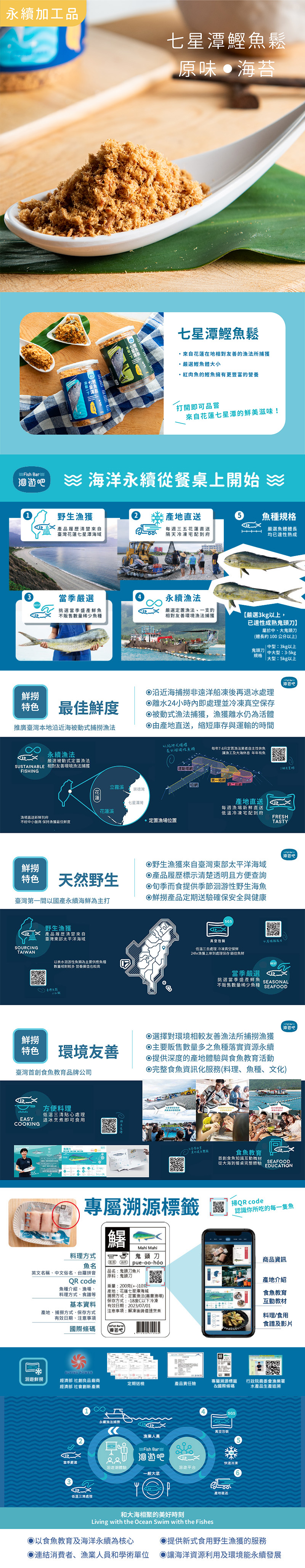 精選臺灣東部的洄游性魚類之大宗「鰹魚」進行製作,由全台灣最大魚鬆加工廠代工製作保存鰹魚風味技術,屬於紅肉魚的鰹魚,相較白肉魚擁有更豐富的營養價值,也擁有獨特的鮮美與甘甜。