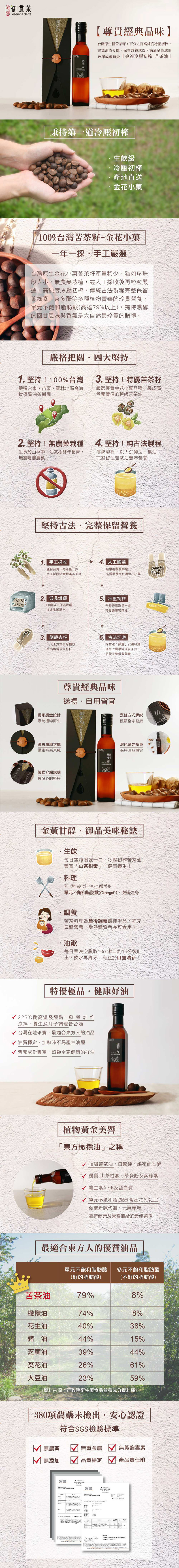 台灣原生種苦茶籽,100%高純度冷壓初榨,古法油渣分離,保留營養成份,滴滴金黃琥珀色澤成就頂級「金淳冷壓初榨苦茶油」。