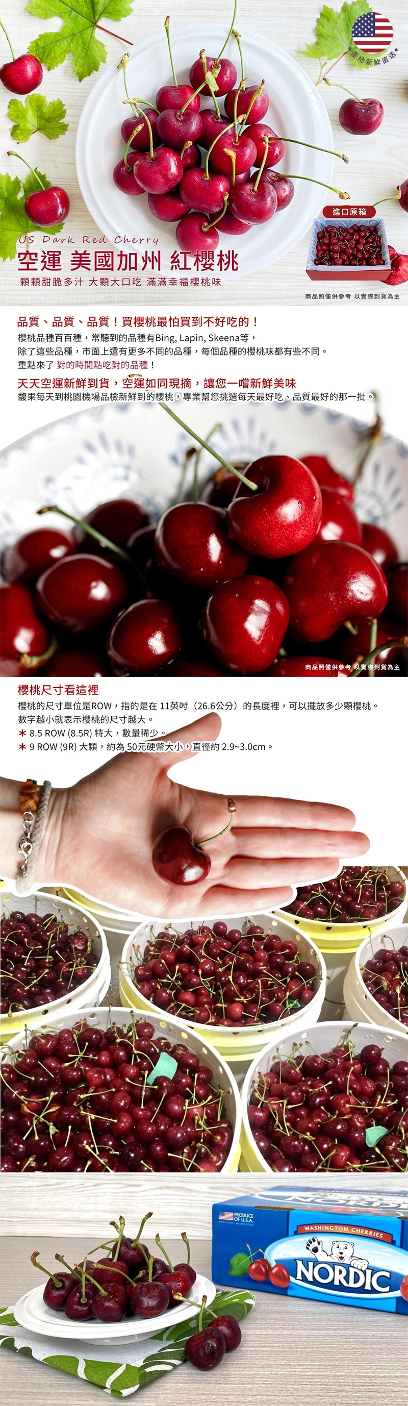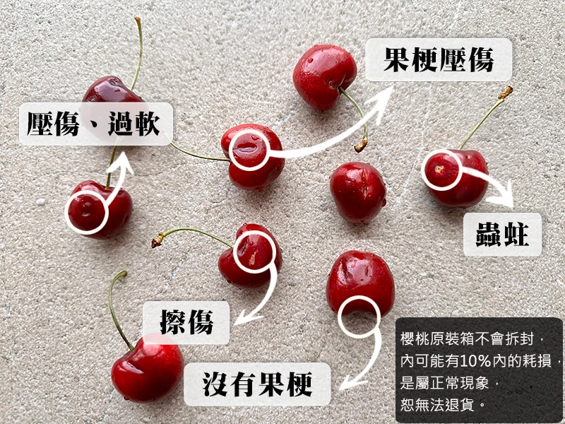 櫻桃色澤和果梗顏色因產地氣候或品種每批不盡相同,果梗也不一定皆為綠色。天然產品可能會有部分缺陷、脫梗或者外觀不美麗的情況,但不影響果實的新鮮度!