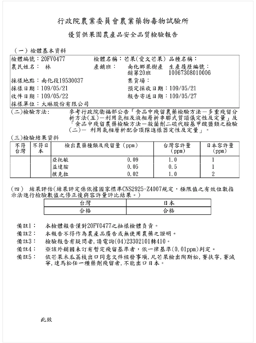 農委會藥物毒物試驗所檢驗報告,台灣、日本檢驗標準皆合格