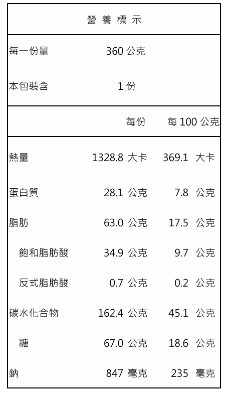 【營養標示】每一份量360公克,本包裝含1份