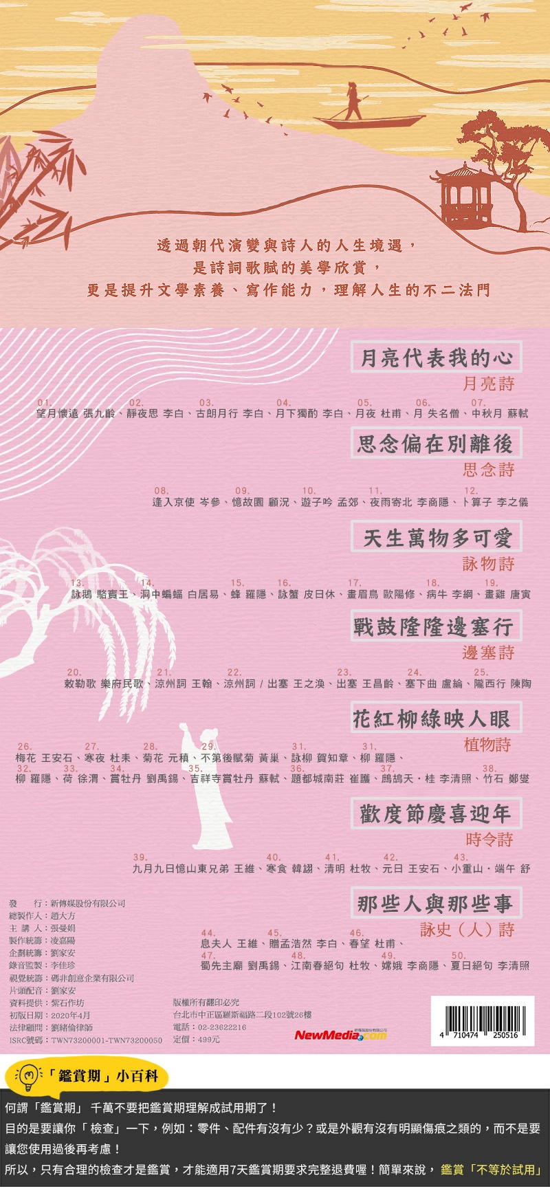 因此特別挑選出經典詩詞,用充滿魅力的聲音用心解說每首詩的內涵與藝術技巧,以及每位詩人的生命經歷,耐人尋味,深入淺出,曉暢易懂。