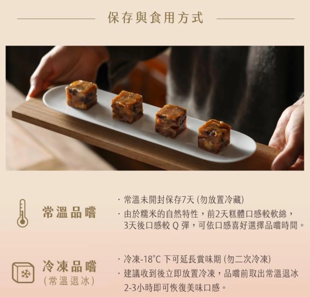 常溫品嚐:未開封常溫保存七天,由於糯米的自然特性,前2天糕體口感較軟綿,3天後口感較Q彈,可依口感喜好調整品嚐時間。(切勿放置冷藏)