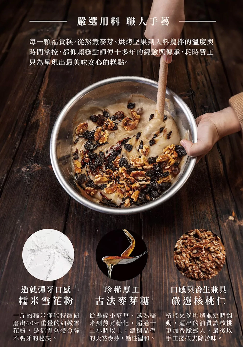 糯米細磨後,僅取最細緻 60%的「雪花糯米粉」 入料,因此糕體格外綿密細緻,入口柔軟不黏牙;搭配 柴燒桂圓的濃郁燻香、以及 低溫烘烤核桃的堅果香氣與酥脆口感,再以 古法熬製麥芽取代一般水飴,帶來自然清甜、香而不膩。