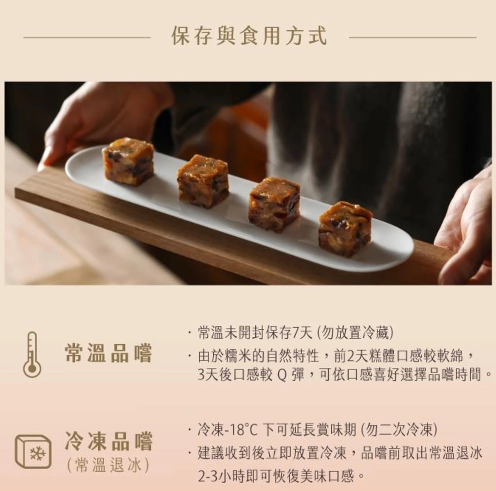 常溫品嚐:未開封常溫保存七天,由於糯米的自然特性,前2天糕體口感較軟綿,3天後口感較Q彈,可依口感喜好調整品嚐時間。(切勿放置冷藏)
