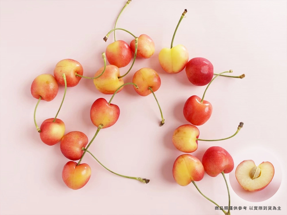 獨特粉嫩的色澤,伴隨嬌嫩欲滴的光澤,一入口便 清甜爆汁、滿口香氣!白櫻桃產量稀少、季節又短暫,堪稱櫻桃界的夢幻逸品;甜而不膩的迷人口感,讓人一顆接一顆,完全停不下來。