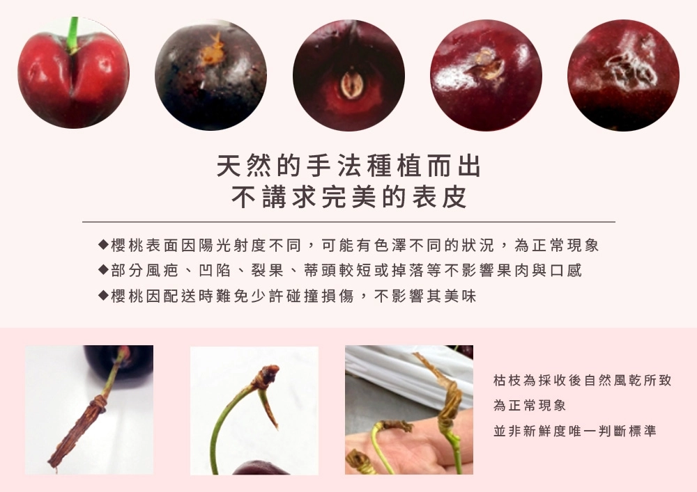 ❶ 櫻桃色澤和果梗顏色因產地氣候或品種每批不盡相同,果梗也不一定皆為綠色。天然產品可能會有部分缺陷、脫梗或者外觀不美麗的情況,但不影響果實的新鮮度!