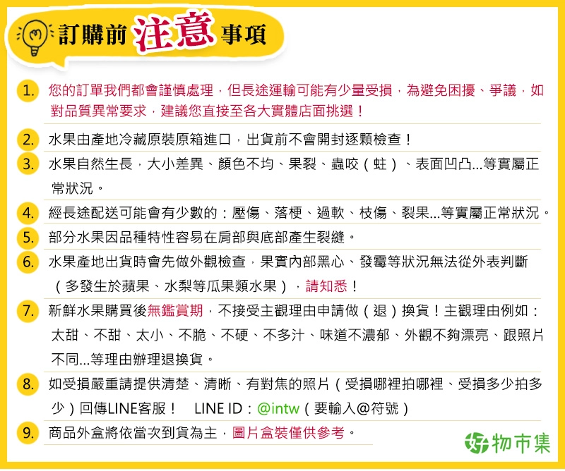 ❸ 水果在裝箱時,品檢外觀皆無問題才出貨,但若收到後有品質疑慮,請於「收貨當日」拍照、上傳好物市集官方Line帳號(@intw),將由專人替您處理退款事宜,謝謝。