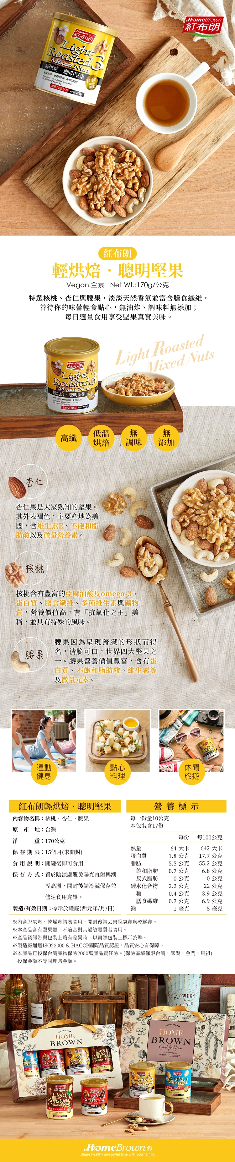 紅布朗嚴選優質堅果原料,由專業 HACCP 及 ISO22000 認證工廠製造,保留新鮮、多種營養素與原始風味,每一口都香脆可口,健康滿分。