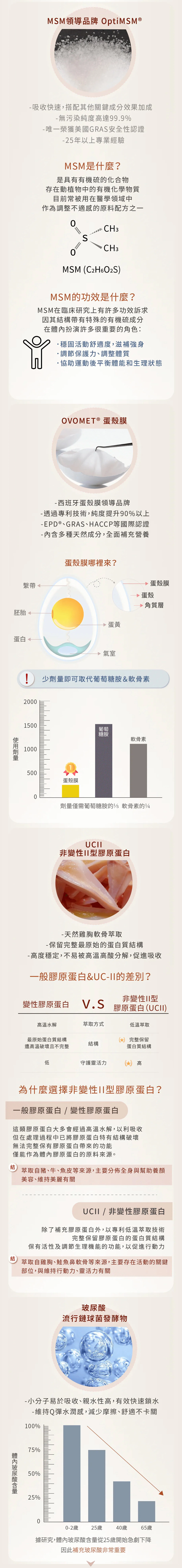 長雙歧桿菌 (Bifidobacterium longum subsp .longum OLP-01)、甲基硫醯基甲烷 (MSM)、B-聚葡萄糖 (黑酵母來源)、D-核糖、流行鏈球菌發酵物 (玻尿酸)、蛋殼膜粉末、葡萄糖胺鹽酸鹽、海藻鈣、薑黃萃取物、雞胸軟骨萃取 (非變性二型膠原蛋白)、複方維生素D3粉 (辛烯基丁二酸鈉澱粉、蔗糖、L-抗壞血酸鈉 (抗氧化劑)、中鏈三酸甘油脂、二氧化矽、生育醇 (抗氧化劑)、維生素D3、麥芽糊精)