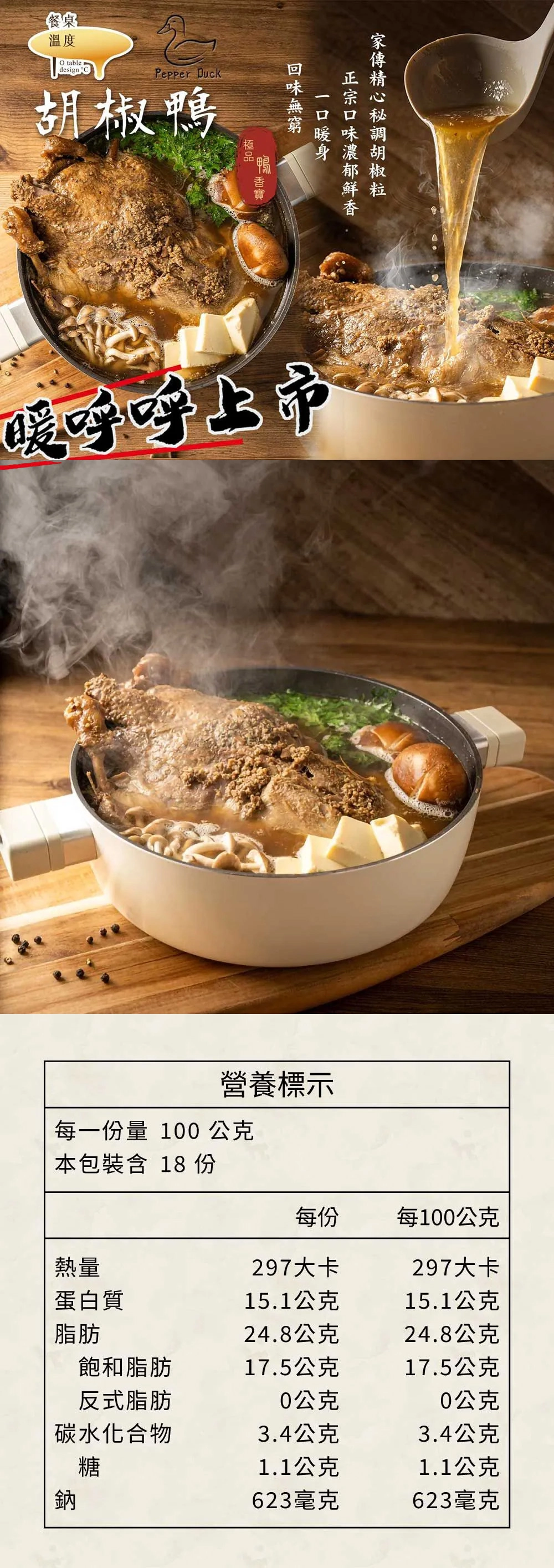 嚴選鮮嫩厚實的鴨肉,搭配家傳精心秘調胡椒顆粒,慢火香燉熬煮 8 小時,釋放香氣四溢、濃郁回甘的湯頭,無添加防腐劑、無亞硝酸鹽,呈現道地東南亞極品好滋味。只此一口,回味無窮,最適合搭配紅白酒,親朋好友家庭聚餐齊聚一堂,享用一鍋熱騰騰、暖胃又暖心的幸福美食;無論過年過節或送禮分享,都是最美味又簡單的好料理。提醒老饕們慢慢品嚐、用心喝湯,幸福滋味在舌尖蔓延。