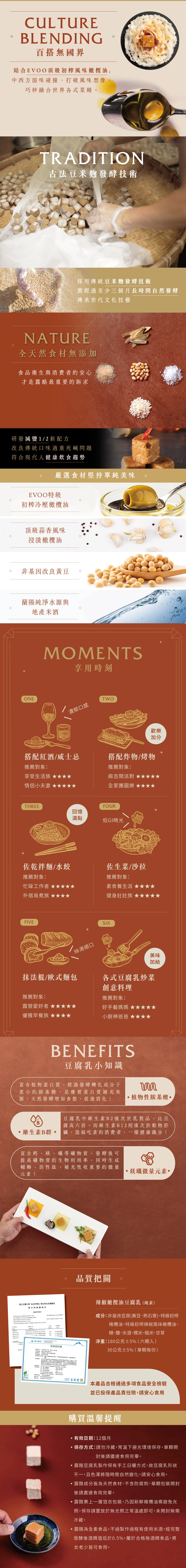 ❶ 露酪豆腐乳製作保有手工日曬方式,故豆腐乳形狀不一,且色澤將隨時間自然變化,請安心食用。