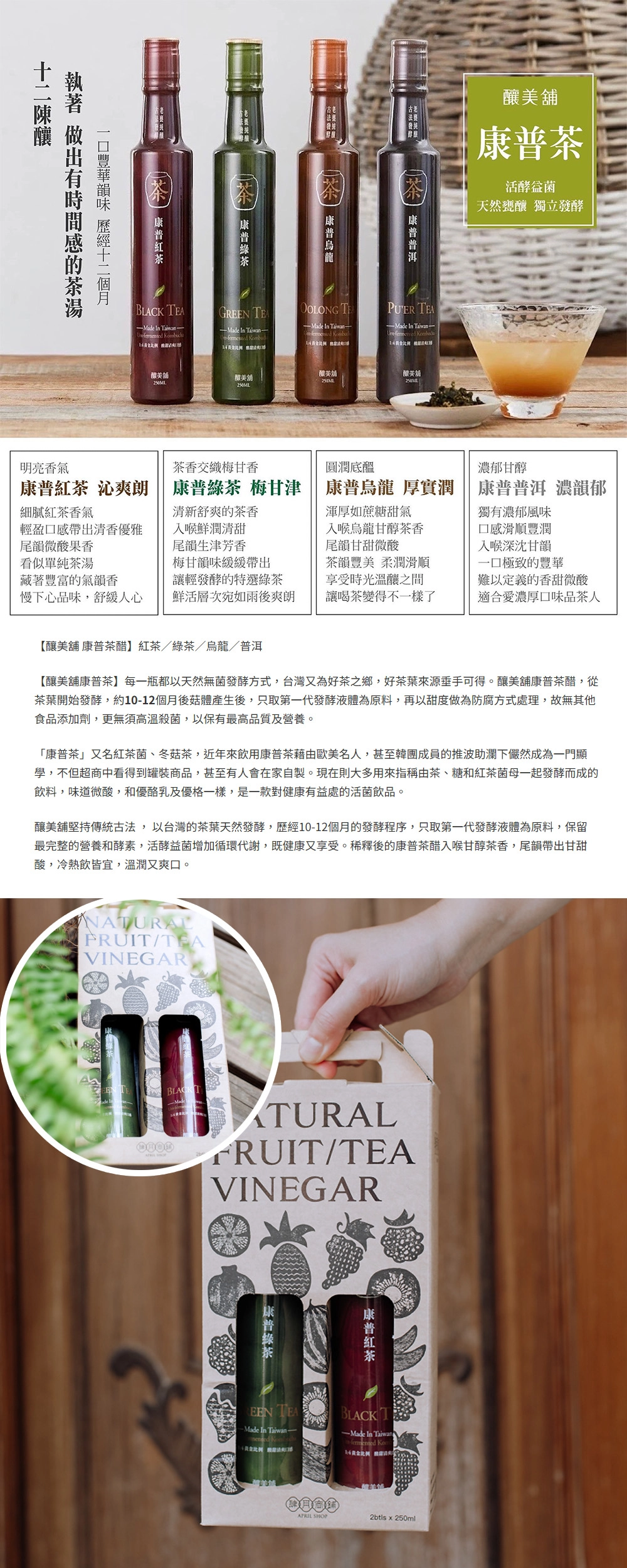 嚴選台灣在地好茶,採用古老自然發酵工法,地下埋缸無菌生態釀造,過程不添加人工香料與防腐劑,只取活性最強、營養最完整的第一代發酵液,保留天然豐富的有機酸與益生益群。入口茶香渾厚甘醇,尾韻帶出清爽酸甜,層次細膩順口,讓健康與好味自然相伴,是值得分享的溫暖心意禮盒。