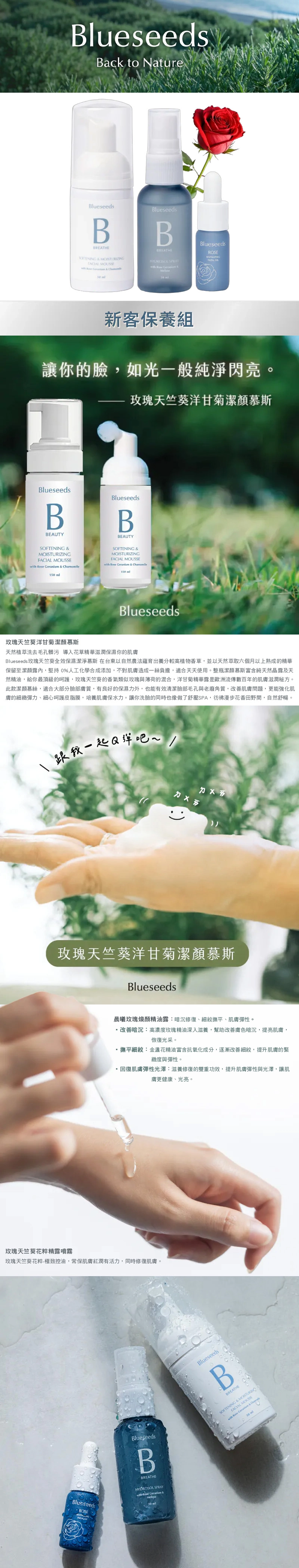 【新客旅行組】芙彤園Blueseeds-晨曦玫瑰煥顏隨身保養組 (保濕潔顏慕斯+保濕精露噴霧+玫瑰精油露)