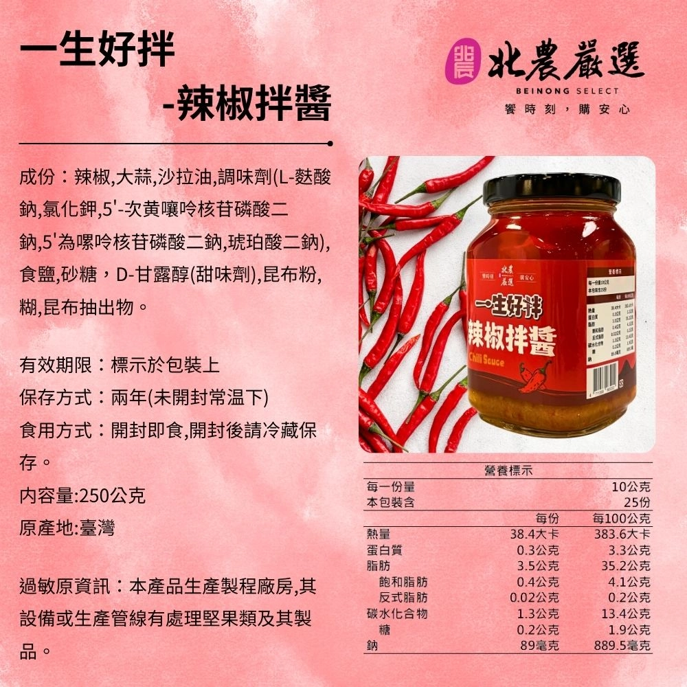 辣椒醬:一生好拌辣椒拌醬,嚴選辣椒與蒜頭調製,香辣夠勁、風味濃厚。拌飯、拌麵或沾食皆適合,輕鬆提升料理層次,是嗜辣者不可錯過的百搭調味。
