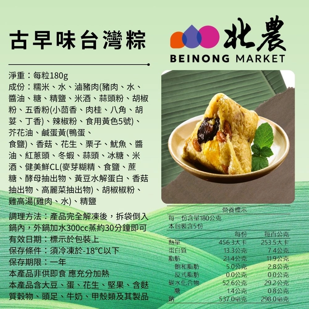 古早味粽:本產品含有蛋、甲殼類、頭足類,大豆及其製品、花生及其製品、堅果類及其製品,不適合其過敏體質者食用。