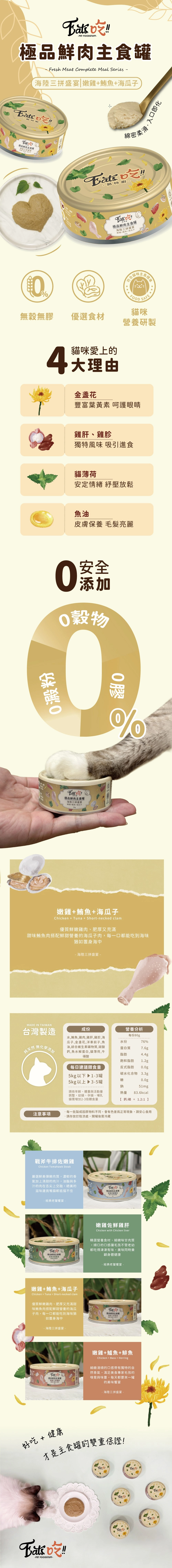 Eats易特廚極品鮮肉主食罐「海陸三拼盛宴(嫩雞+鮪魚+海瓜子)」,嚴選新鮮雞肉搭配雞肝,結合甜味鮪魚與鮮甜營養的海瓜子肉,提供豐富蛋白質與必需胺基酸,打造均衡美味的每日主食。細緻滑順的口感融合多層次鮮香,讓貓咪一吃就愛上。