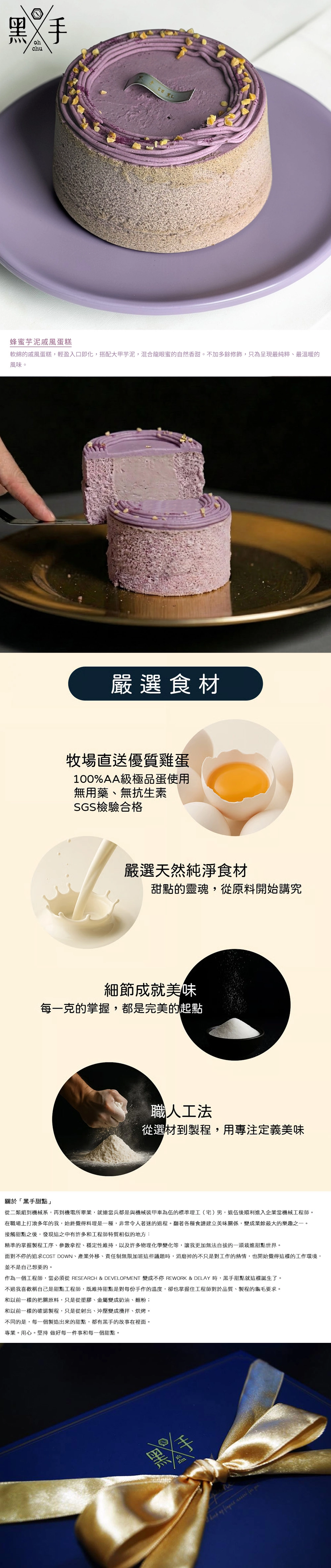 我們不添加多餘的修飾,只希望保留食材最原始的美好,讓你在每一次品嚐時,都能感受到芋泥的綿密、蜂蜜的溫潤,以及戚風蛋糕那一抹輕盈的幸福感;簡單,卻足以溫暖每一個喜歡甜點的心。