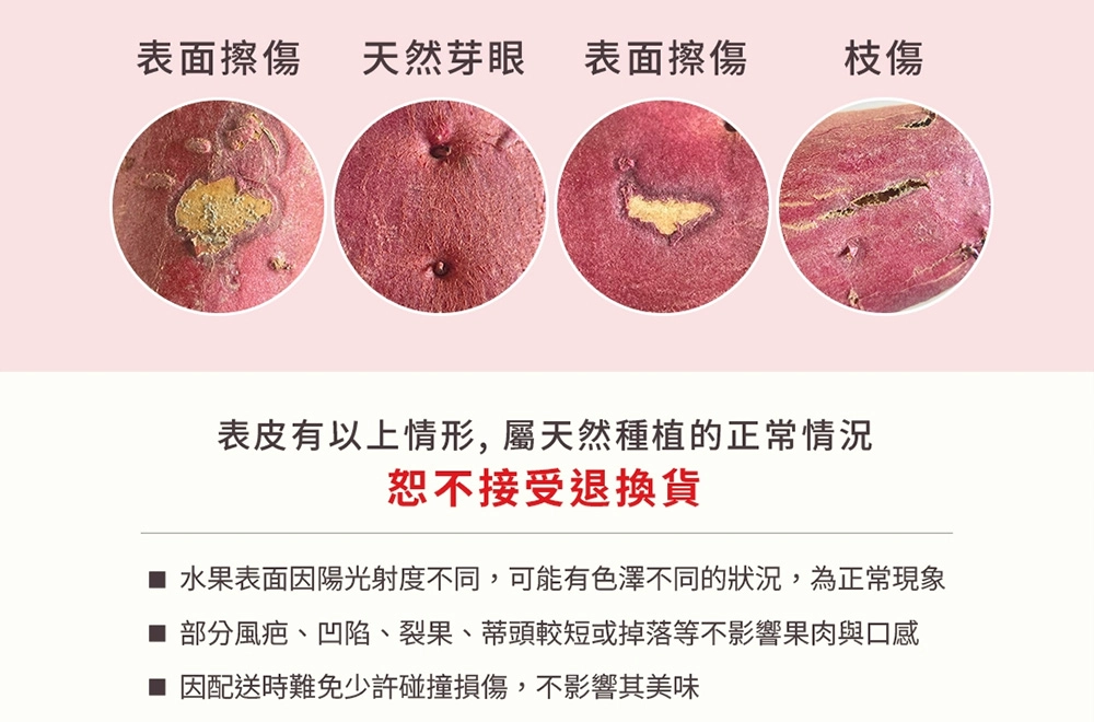 ❷ 地瓜皆是自然生長,由農民一顆顆手採,再經由長途運輸後抵達台灣;表皮會有採收、運輸時產生的輕微痕跡 ( 如:枝傷、碰撞等),並不影響實際口感喔!